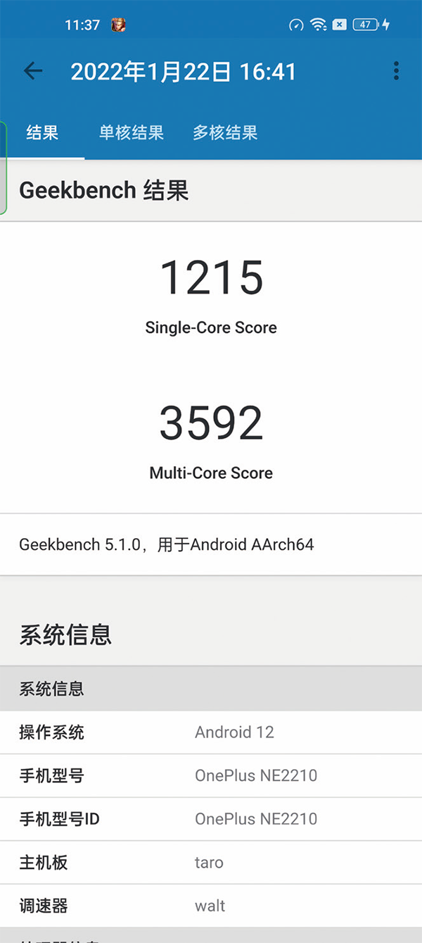 在測試CPU性能的GeekBench 5中,一加10 Pro也斬獲了單核1215分,多核3592分的好成績。