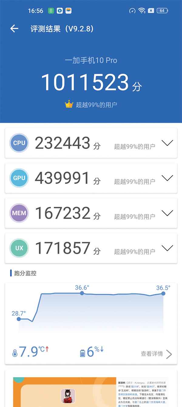 一加10 Pro在《安兔兔評測》中得到1011523的高分,也是一加首款突破一百萬分的機型。