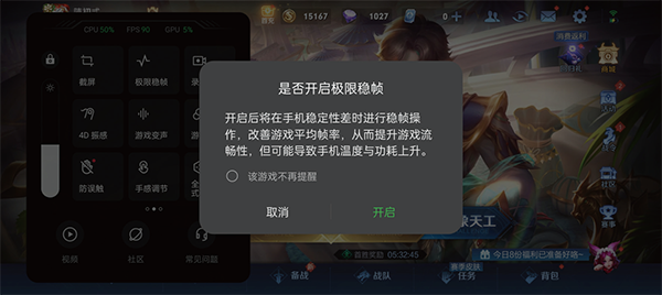 在游戲時滑動側邊欄可以開啟HyperBoost全鏈路游戲穩(wěn)幀,能夠有效控制游戲幀率的平穩(wěn)。