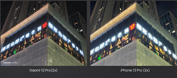 小米12 Pro拍攝出來(lái)的照片中,建筑物表面的發(fā)光字體,白色發(fā)光字體非常清晰,但是紅色的發(fā)光字體卻不如白色的發(fā)光字體清晰。iPhone 13 Pro拍攝的照片中,紅色的發(fā)光字體十分清晰,而相反的是白色的發(fā)光字體則不如小米12 Pro拍攝的清晰度高。