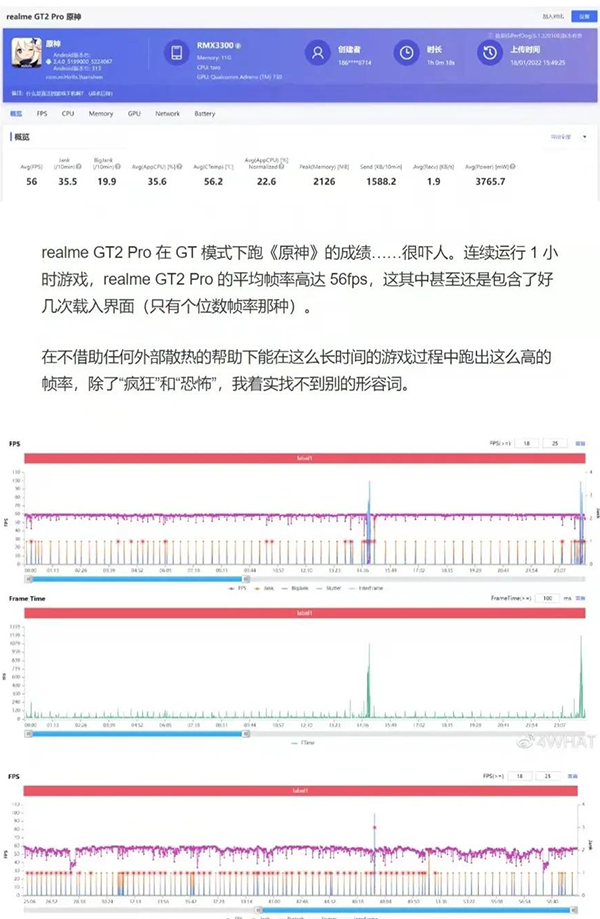 在一小時的《原神》游戲?qū)崪y中顯示,真我GT2 Pro在整個游戲過程中表現(xiàn)非常穩(wěn)定,平均幀率高達56FPS!穩(wěn)定的幀率即是游戲完美運行的結(jié)果,也是用戶能夠享受游戲的基礎?!对瘛肥且豢顚κ謾C性能和散熱極度考驗的一款3A大作,現(xiàn)在真我GT2 Pro可以說已經(jīng)擁有流暢運行《原神》的能力了!