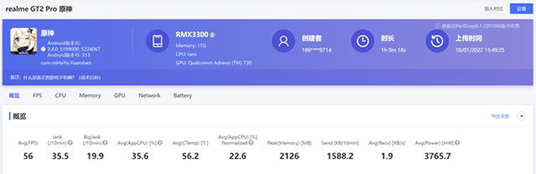男生買手機,玩游戲,肯定是必須的,所以我這次重點實測的是對于性能要求更高的《原神》,先給大家看看實測的數(shù)據(jù),大概一個小時的時間,realme真我GT2 Pro的平均幀率高達56FPS,而且這個成績是沒有借助散熱背夾下實測的,這個表現(xiàn)確實強悍。