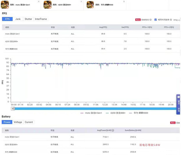 《和平精英》游戲中,打開(kāi)超高清畫(huà)質(zhì)和抗鋸齒模式,edge X30、iQOO 8 Pro和華為Mate40基本都維持在90幀,不過(guò)幀率波動(dòng)上,X30平均幀率89.8,最大波動(dòng)0.5幀,iQOO 8 Pro平均幀率88.8幀,最大幀率波動(dòng)7.8幀,華為Mate40平均幀率89.4,最大幀率波動(dòng)2.5幀。從功耗上看,X30達(dá)到7.1W,iQOO 8 Pro為2.8W,華為Mate40為6.2W,驍龍8 Gen1功耗有點(diǎn)高。溫度上,X30背面最高溫度45.6°,iQOO 8 Pro最高溫度39.3,華為最高42.3。
