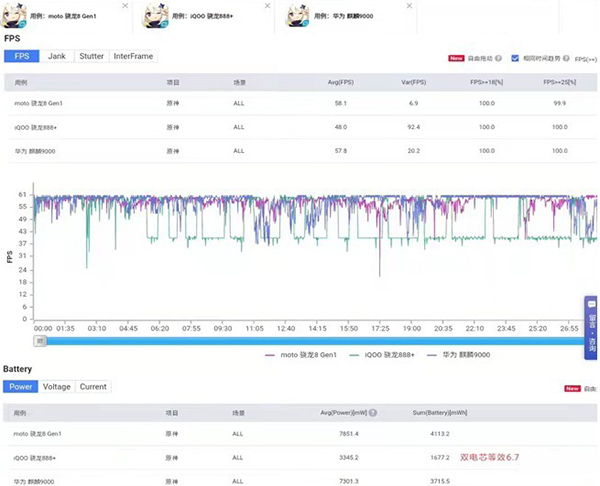 在《原神》30分鐘測(cè)試中,開(kāi)啟全高清+60幀,摩托羅拉edge X30平均幀率58.1幀,最大幀率波動(dòng)6.9幀,不過(guò),隨著時(shí)間增加,屏幕亮度和幀率都在下降。iQOO 8 Pro平均48幀,幀率波動(dòng)92.4幀,華為Mate40平均57.8幀,幀率波動(dòng)20.2幀。功耗上,X30在7.8W,iQOO 8 Pro為3.3W(這款手機(jī)有點(diǎn)保守),華為7.3W。溫度上,X30背面最高44.4度,iQOO 8 Pro為40.1度,華為Mate40為44.4度。