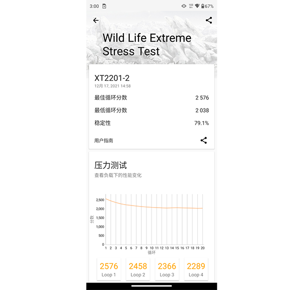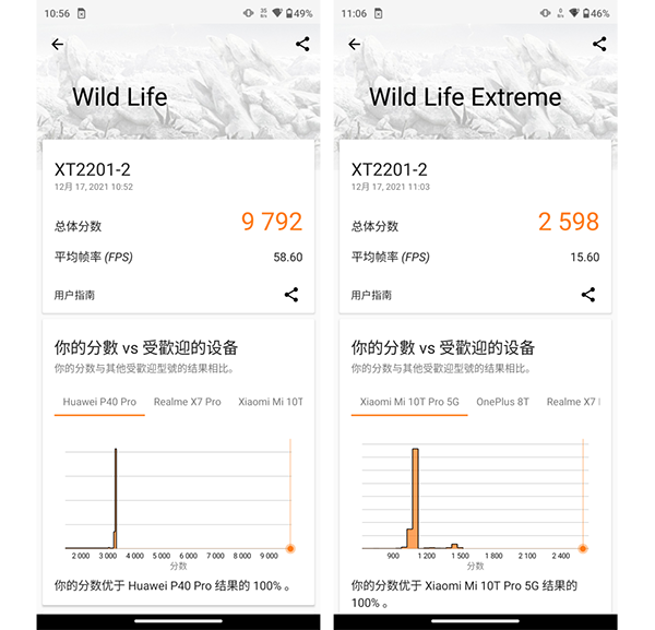 最后再看3DMark,這里選擇基準的WildLife以及更嚴苛的WildLife Extreme來作參考。先是WildLife得9792分,平均幀率58.6fps;不過性能要求更嚴苛的WildLife Extreme得分近2598,平均幀率15.6fps;作為對比,BenchMark數(shù)據(jù)庫里的iPhone13 Pro的A15Bionic平臺WildLife分數(shù)是9629,平均幀率57fps,WildLife Extreme為3022分,平均幀率18fps;iQOO8 Plus的驍龍888Plus平臺WildLife得分5433,平均幀率32fps,WildLifeExtreme得分1393,平均幀率8fps——看來這一代驍龍8平臺的GPU性能進步是非常顯著的。