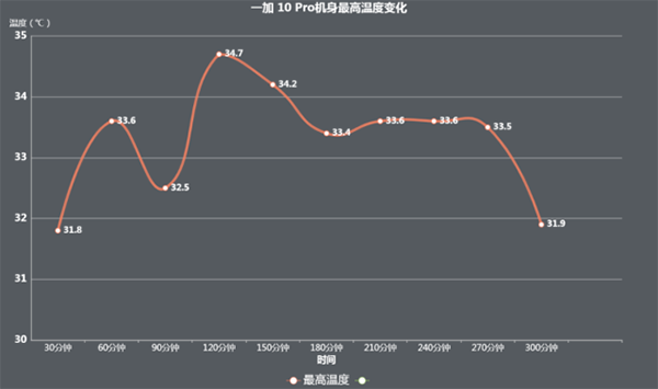 除了幀率表現(xiàn),一加10 Pro在這5.5小時(shí)的“測(cè)到飽”測(cè)試中,溫控的情況也同樣是讓人感到滿意。從機(jī)身最高溫度的變化圖我們可以得知:游戲運(yùn)行到120分鐘時(shí)溫度來到了34.7℃,在所有統(tǒng)計(jì)的數(shù)值中最高,此后的幾個(gè)小時(shí)里機(jī)身溫度基本都穩(wěn)定在33℃上下,這溫度控制能力令我感到非常驚訝,平日在開啟超高分辨率、超高幀率的情況下,能夠?qū)囟瓤刂圃?0℃左右就已經(jīng)是優(yōu)秀的水平了,這回一加10 Pro立體空間散熱系統(tǒng)的超大散熱面積一展拳腳,算是讓我見識(shí)到其威力了。