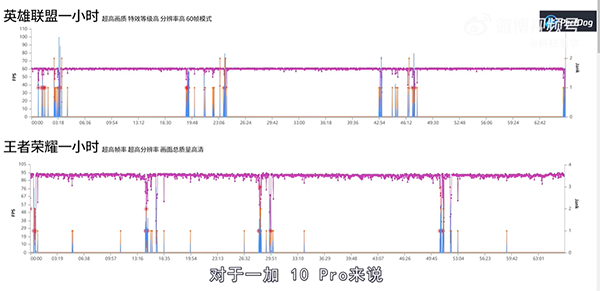 具體來講,在分別暢玩一小時英雄聯(lián)盟手游和王者榮耀兩款MOBA類游戲測試中,一加10 Pro的平均幀率可以說都達(dá)到了滿幀水準(zhǔn),并且機(jī)身最高溫度也控制在40℃上下。而在開啟HDR高清、極限幀率及抗鋸齒開模式下,暢玩一小時《和平精英》后,我們也可以看到幀率數(shù)據(jù)線也十分平穩(wěn),同樣幾乎是滿幀運(yùn)行狀態(tài)。此外,在超長時間連續(xù)運(yùn)行游戲測試中,一加10 Pro也可以堅持高畫質(zhì)玩王者榮耀四個半小時以上,這個成績也獲得博主的肯定。