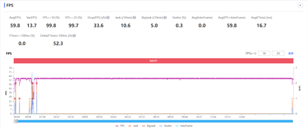 在30分鐘《和平精英》測試中,幀率圖基本一條直線,也符合旗艦機(jī)的水準(zhǔn)。而未開啟時(shí),一加10 Pro的幀率也表現(xiàn)不錯(cuò),基本穩(wěn)定在56幀左右,差距不大,但說明性能強(qiáng)勁。