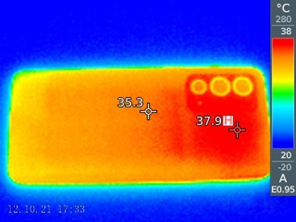 我們?cè)谟靡患?RT玩游戲一小時(shí)后機(jī)身最高溫度僅為37.9度,并且沒(méi)有出現(xiàn)很明顯的局部熱點(diǎn)。在實(shí)際的游戲過(guò)程中,我們發(fā)現(xiàn),一加9RT的機(jī)身溫度散布得十分均勻,就算我們長(zhǎng)時(shí)間保持同一個(gè)姿勢(shì)進(jìn)行游戲,也不會(huì)感覺(jué)到燙手感。
