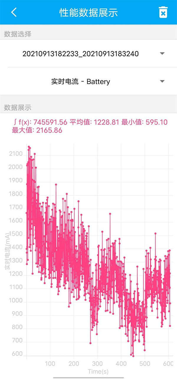 開啟優(yōu)化功耗之后,數(shù)據(jù)似乎更離譜了,平均電流1285.17mA,最大電流低了一些,只有2044.09mA,最小電流來到了643.01mA。