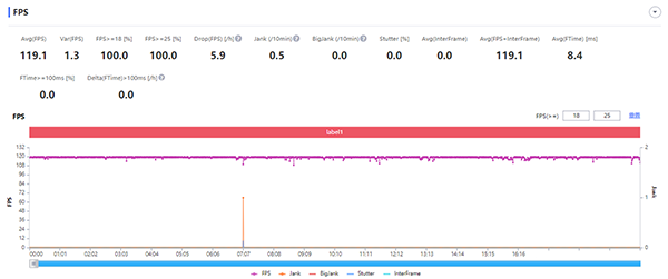 在實際游戲體驗場景中,iQOO 9的表現(xiàn)同樣有非常出眾的平穩(wěn)幀率表現(xiàn)?!锻跽邩s耀》開啟120幀模式,其余畫質(zhì)一應(yīng)選最高,可以看到的是平均幀率達(dá)到了119.1fps,并且整個過程幾乎沒有任何波動,效果異常穩(wěn)定。