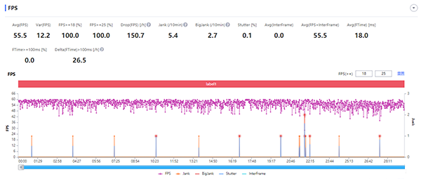 最后是目前旗艦機都躲不過的《原神》,在高畫質(zhì)下開放60fps上限,可以看到得到的幀率表現(xiàn)還是相當(dāng)不錯的,測試方式為高畫質(zhì)60fps在璃月城內(nèi)跑圖半小時,平均幀數(shù)55.5fps,最低幀率保持在40fps以上。22分左右的那一處低幀率是因為不小心開啟了活動界面所以幀數(shù)下降,屬于例外情況。