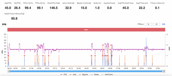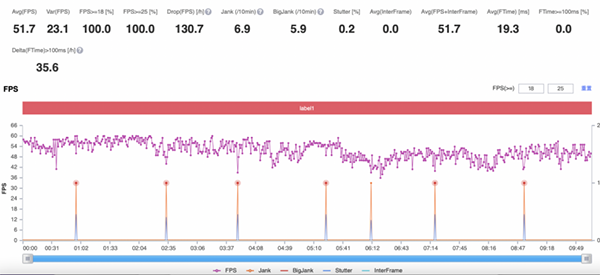 同樣運行環(huán)境開啟高幀低功耗選項后,獨立顯示芯片Pro幫助主芯片GPU進行圖形渲染,使得iQOO 9 Pro產(chǎn)生的功耗更少,性能釋放更穩(wěn)定。但受限于Perfdog軟件只能對GPU數(shù)據(jù)進行監(jiān)測的緣故,所以iQOO 9 Pro測試出來的游戲幀率數(shù)據(jù)為45幀,而實際的運行幀率為90幀。
