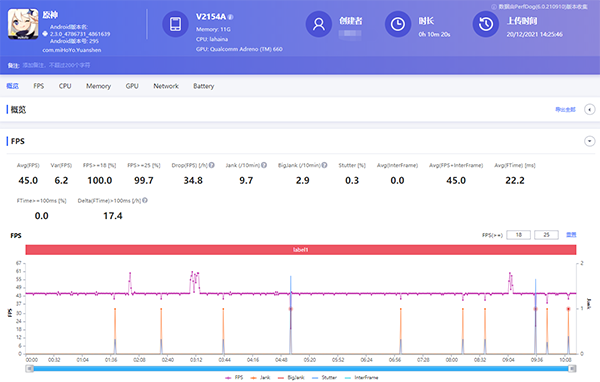 我在玩《原神》這款游戲的時候就體驗了一下游戲插幀,下面就是軟件實測得到的《原神》游戲幀率數(shù)據(jù)圖,平均幀率為45.0幀。有一點需要注意,游戲過程中軟件測不到芯片插入的過渡幀,因此實際平均幀率應(yīng)為圖中數(shù)據(jù)的兩倍,也就是90幀。