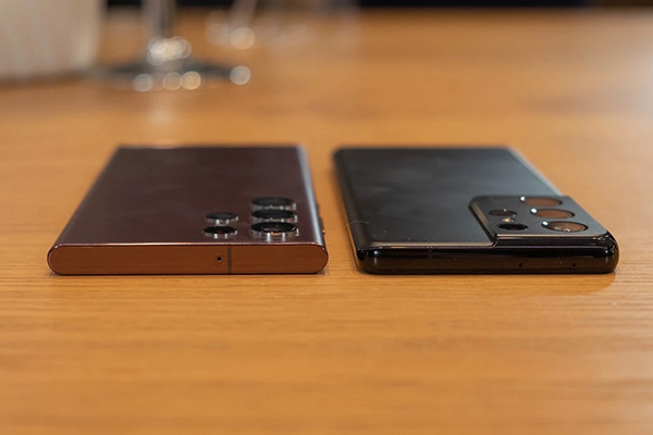 我們很容易從手機(jī)背面將兩款機(jī)型區(qū)分開(kāi)來(lái)。Galaxy S21 Ultra有一個(gè)大的攝像頭凸起,溢出到手機(jī)的邊緣,而Galaxy S22 Ultra所有攝像頭都是分開(kāi)排列的。