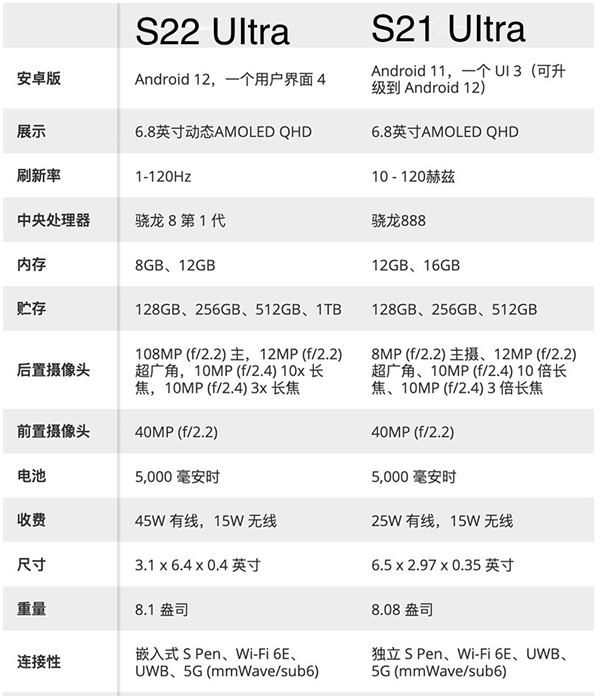 下面是三星Galaxy S22 Ultra與Galaxy S21 Ultra詳細(xì)參數(shù)對(duì)比圖,主要區(qū)別很明顯