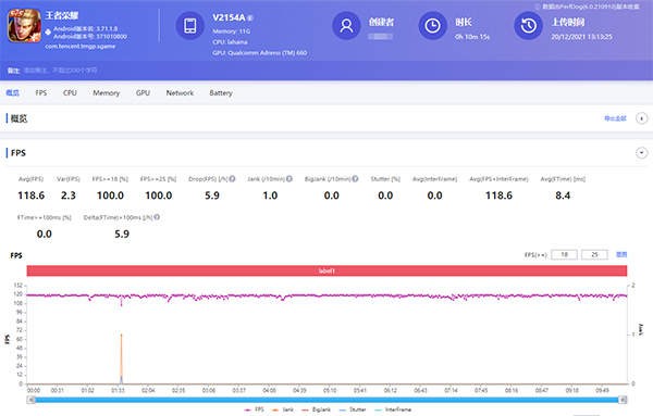 例如在《王者榮耀》原生120幀模式下,iQOO 9 Pro不僅開啟、加載游戲時(shí)非常迅速,同時(shí)進(jìn)入游戲?qū)趾?,依然能夠保持很高的流暢度,整局游戲下?lái)平均幀率達(dá)到了118.6FPS,且?guī)时憩F(xiàn)平穩(wěn),期間并未出現(xiàn)較大的波動(dòng),基本達(dá)到了滿幀運(yùn)行狀態(tài)。