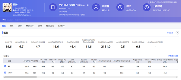 《原神》作為一款獨(dú)立開(kāi)放類(lèi)游戲,對(duì)于手機(jī)硬件性能要求較高。不過(guò)根據(jù)測(cè)試結(jié)果來(lái)看,iQOO Neo5活力版游戲幀率居然也能維持在60幀左右,有點(diǎn)出乎我的意料。除了前期游戲進(jìn)入任務(wù)界面播放CG動(dòng)畫(huà)時(shí)會(huì)出現(xiàn)比較明顯的幀率波動(dòng),后期游戲幀率基本穩(wěn)定,整個(gè)游戲體驗(yàn)還是比較滿(mǎn)意。
