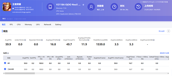 根據(jù)實(shí)測(cè),在《王者榮耀》游戲中,iQOO Neo5活力版游戲幀率穩(wěn)定在60幀,幀率基本無(wú)波動(dòng)。整個(gè)游戲測(cè)試過(guò)程中,游戲運(yùn)行流暢,畫(huà)面無(wú)卡頓,驍龍870處理器展現(xiàn)了應(yīng)有的性能水準(zhǔn),符合預(yù)期。