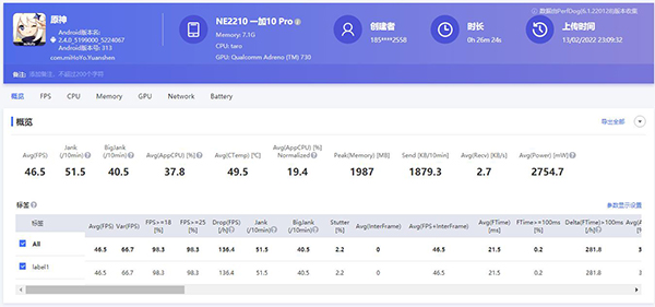 一加10 Pro在《原神》的測(cè)試中表現(xiàn)符合其定位,能效控制的也比較不錯(cuò),2754.7mW的表現(xiàn)也在眾多旗艦機(jī)中表現(xiàn)亮眼,平均每十分鐘的卡頓次數(shù)是51.5,平均每十分鐘嚴(yán)重卡頓次數(shù)是40.5,在游戲流暢性方面還需要提高。