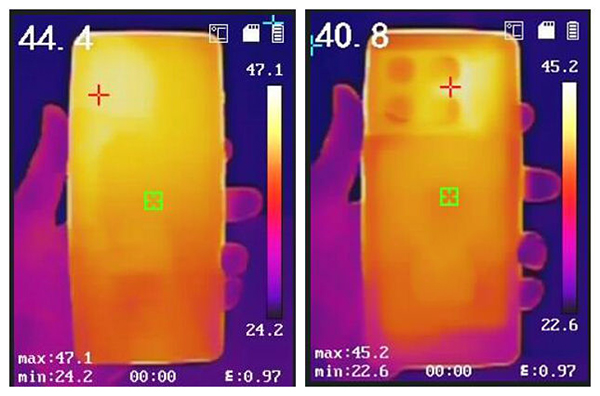 在實(shí)測(cè)環(huán)境中發(fā)現(xiàn),一加10 Pro在極限畫質(zhì)60幀模式跑出了平均幀率46.5fps,機(jī)身正面平均溫度為44.4℃、機(jī)身背面平均溫度為40.8℃,通過熱成像儀進(jìn)行實(shí)測(cè)發(fā)現(xiàn),熱源主要來源內(nèi)屏頂部區(qū)域及后置攝像頭模組區(qū)域,整體熱量分布較為均勻。