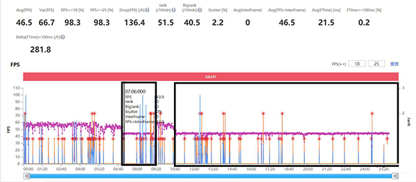 通過上述約26分鐘游戲長呈現(xiàn)出來的幀率圖表來看,游戲運(yùn)行在約7分鐘左右出現(xiàn)掉幀現(xiàn)象,此時(shí)小編正在進(jìn)行第二個(gè)日常任務(wù),在游戲中面對(duì)多個(gè)敵人后游戲人物釋放技能進(jìn)行戰(zhàn)斗,此時(shí)畫面出現(xiàn)較為明顯的掉幀和卡頓現(xiàn)象,游戲約9分鐘后也就是完成第二個(gè)日常任務(wù)(戰(zhàn)斗時(shí)長約2分鐘),幀率恢復(fù)到游戲初始狀態(tài),但是1分鐘過后(游戲總時(shí)長10分鐘)又出現(xiàn)掉幀現(xiàn)象,游戲流暢度明顯大打折扣。