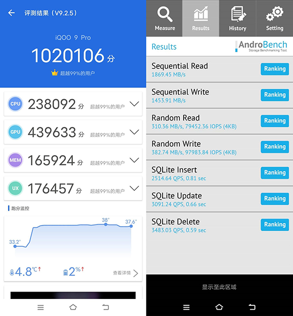 得益于驍龍8 Gen1處理器的強(qiáng)勢表現(xiàn),iQOO 9 Pro在性能上也隨之水漲船高,實(shí)測安兔兔性能跑分可以輕松突破百萬大關(guān),得到了1020106分的驚人成績,是當(dāng)前性能跑分最高的手機(jī)之一。除此之外,iQOO 9 Pro還首發(fā)了三星超頻版UFS 3.1高速儲存芯片,搭配增強(qiáng)版LPDDR5+內(nèi)存融合2.0技術(shù),大幅提升了手機(jī)存儲性能,根據(jù)AndroBench實(shí)測,iQOO 9 Pro順序讀寫成績分別達(dá)到了1869MB/s、1453MB/s,均處于行業(yè)領(lǐng)先水準(zhǔn)。