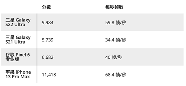 Galaxy S22 Ultra也完全擊敗了Google Pixel 6 Pro,后者在同一測試中達(dá)到了6682和40 fps。盡管如此,iPhone 13 Pro Max仍然以11418和68.4 fps的平均速度名列前茅。