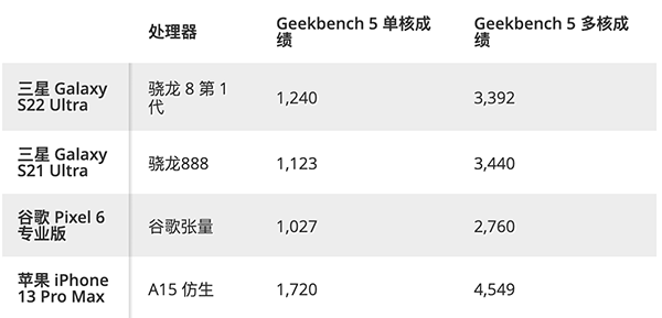 奇怪的是,Galaxy S22 Ultra評測單元的多核得分為3392,低于S21 Ultra的3440。較新的Ultra仍然領(lǐng)先于Pixel 6 Pro的Tensor芯片 (2760)。iPhone 13 Pro Max再次以4549的成績在該領(lǐng)域占據(jù)主導(dǎo)地位。