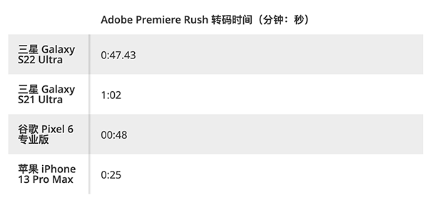 Galaxy S22 Ultra再次以47秒的時間遙遙領(lǐng)先于前代機型,而前代S21 Ultra完成相同任務(wù)的時間為1分2秒。Pixel 6 Pro用時48秒,與S22 Ultra相當(dāng),而iPhone 13 Pro Max僅需25秒。
