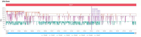 CPU 0-3是A510小核,4-6是A710中核,7是X2超大核??梢钥吹?,相比我們上次測試過的iQOO 9 Pro,GT2 Pro的CPU頻率調校要激進不少,游戲過程中大核能長時間保持在2GHz以上運行,中核也有1.7GHz以上,對比iQOO的大核中核都是1.5GHz的策略,顯然要激進很多(iQOO在測試的時候也開啟了Monster模式)。