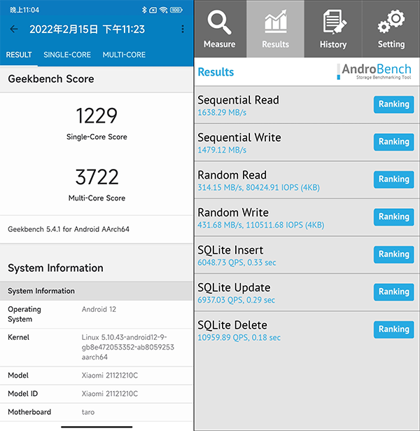 主要包括Geekbench 5跑分、Androbench閃存速度測試、安兔兔跑分三個部分,測試環(huán)境為室內(nèi)16℃、全程連接WiFi。