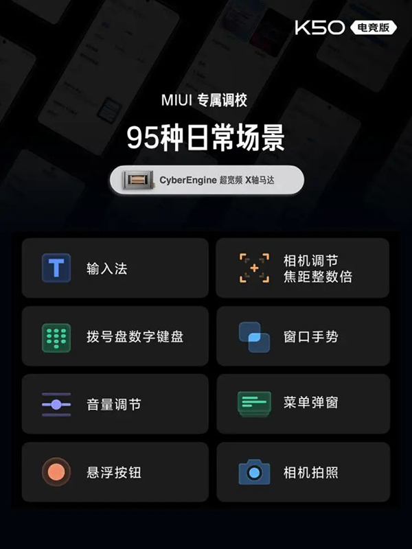 手機(jī)馬達(dá)的好壞對于體驗(yàn)的影響是很直觀的,雖然很多人平時不喜歡開啟馬達(dá),但是游戲場景下馬達(dá)震感確實(shí)會帶來更好的體驗(yàn)。紅米K50電競版全球首發(fā)的CyberEngine 超寬頻 X軸線性馬達(dá),Redmi 稱可以媲美 iPhone 振動體驗(yàn),適配了《和平精英》《天渝》《王牌競速》等游戲的 4D 震感,在游戲中換彈夾、射擊、駕駛載具,都能感受到不同的震動效果。即使不開聲音,也有足夠的臨場感。
