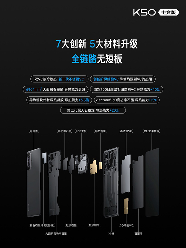 因此,在技術(shù)和創(chuàng)新上,Redmi為K50電競版開出的“藥方”是7大創(chuàng)新和5大材料的升級,并采用了熱源分離布局+雙區(qū)溫控技術(shù),從而形成全鏈路無死角的立體散熱系統(tǒng)。這其中,雙VC總面積高達4860平方毫米,僅主VC面積就高達4015平方毫米,覆蓋了處理器和電池的上半部分;而副VC面積則是845平方毫米,覆蓋主板副板的兩顆充電IC并為他提供散熱支持。