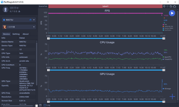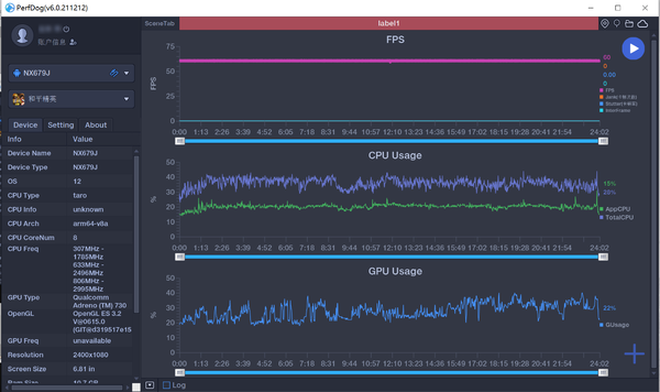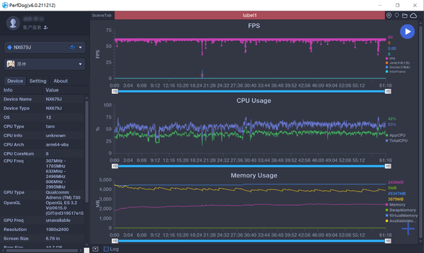 采用PerfDog進(jìn)行實(shí)時(shí)幀率監(jiān)測(cè),游戲畫(huà)面設(shè)置最高效果和60幀模式,紅魔7使用「覺(jué)醒模式」和開(kāi)啟智能風(fēng)扇散熱。實(shí)測(cè)可以實(shí)現(xiàn)滿60幀運(yùn)行,而且這次特意做了1小時(shí)超長(zhǎng)游戲時(shí)間壓力測(cè)試??梢钥吹秸麄€(gè)游戲過(guò)程幀率都非常平穩(wěn),4位人物角色開(kāi)大的時(shí)候也沒(méi)有掉幀,體驗(yàn)很絲滑。這絕對(duì)不是原地站著1小時(shí)的游戲幀率,是實(shí)實(shí)在在地玩了1個(gè)小時(shí)的真實(shí)游戲幀率圖。而直線中間有幾個(gè)明顯低幀數(shù)的,則是在跑地圖、載入場(chǎng)景的時(shí)候。