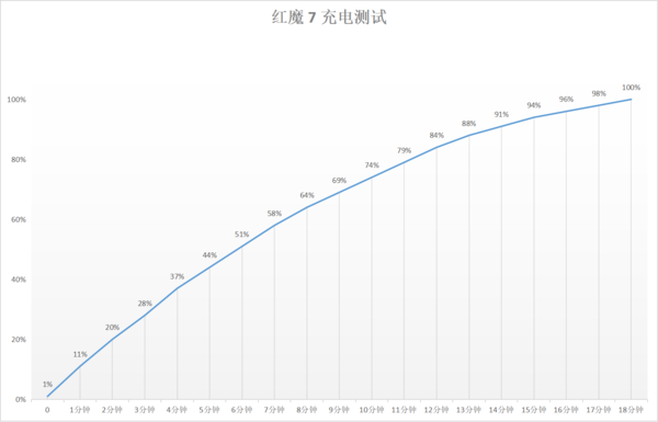 重點(diǎn)是在充電方面,紅魔7依舊是支持120W快速充電,紅魔7本身只是支持到120W的閃充,但充電頭還是配了165W氮化鎵新版本,這款充電頭除了支持紅魔的百瓦閃充之外,也支持PD、QC協(xié)議,對(duì)很多第三方設(shè)備比較友好。實(shí)測(cè)在低電量下,采用官方配送的165W氮化鎵快充頭實(shí)際充入峰值功率為99W左右。手機(jī)在耗電至1%并提示最后60秒后自動(dòng)關(guān)機(jī)狀態(tài)下,插入官方配送充電頭經(jīng)常充電測(cè)試,考慮到充電效率比較高,所以采用了每1分鐘記錄一次數(shù)據(jù)。
