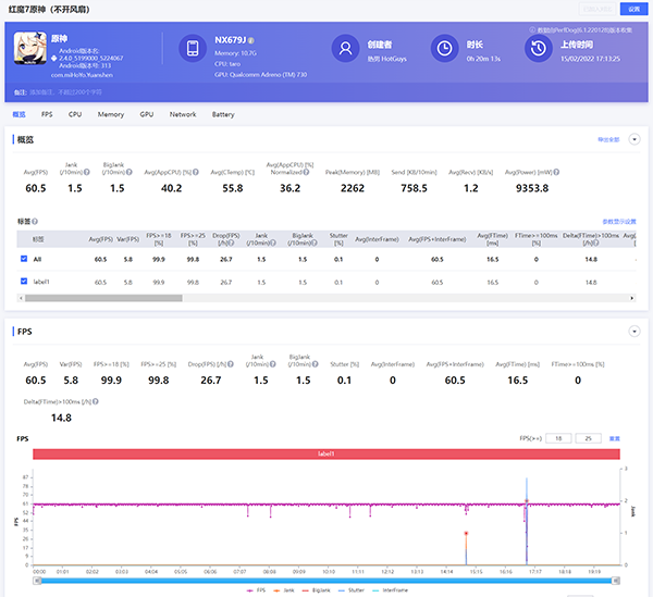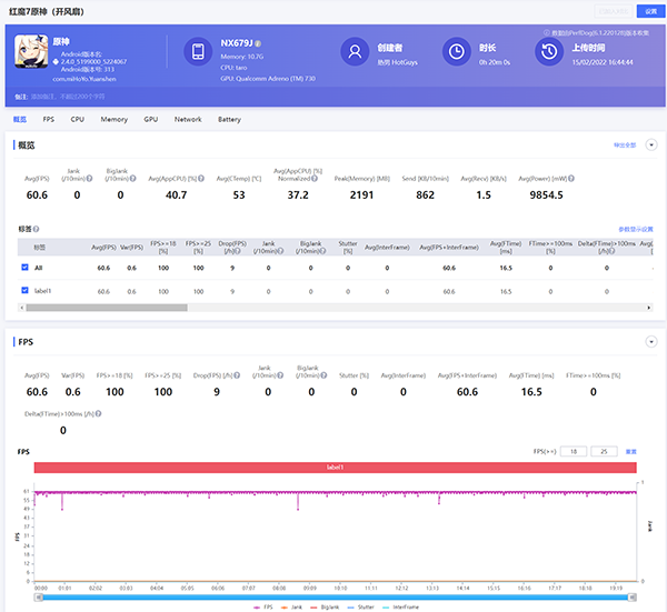 除了跑分以外,熱男游戲部門的專業(yè)人員也測(cè)試了幾款比較有代表性的游戲,先來看看“知名手機(jī)性能測(cè)試軟件”《原神》的表現(xiàn),在最高畫質(zhì)60幀關(guān)閉動(dòng)態(tài)模糊的情況下,紅魔7覺醒模式關(guān)掉風(fēng)扇,20分鐘璃月港夜間跑圖,平均幀率是60.5幀。