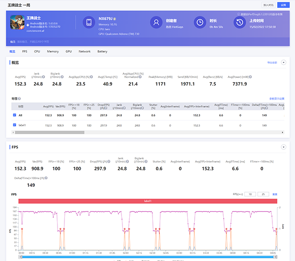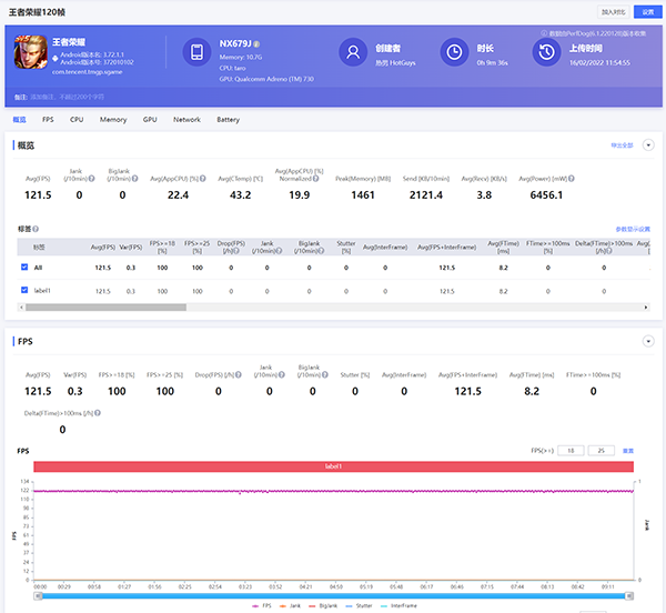 《王者榮耀》120幀模式一局下來平均幀率是121.5幀,從這些游戲幀數(shù)的測(cè)試數(shù)據(jù)來看,紅魔7的游戲表現(xiàn)還是非常不錯(cuò)的。
