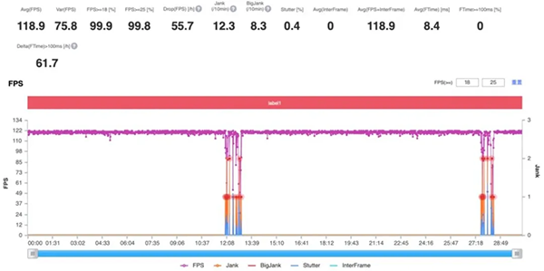 實(shí)測(cè)畫質(zhì)全開的情況下,完全穩(wěn)住120幀,幾乎就是一條直線(兩次明顯波動(dòng)為新開對(duì)局)。