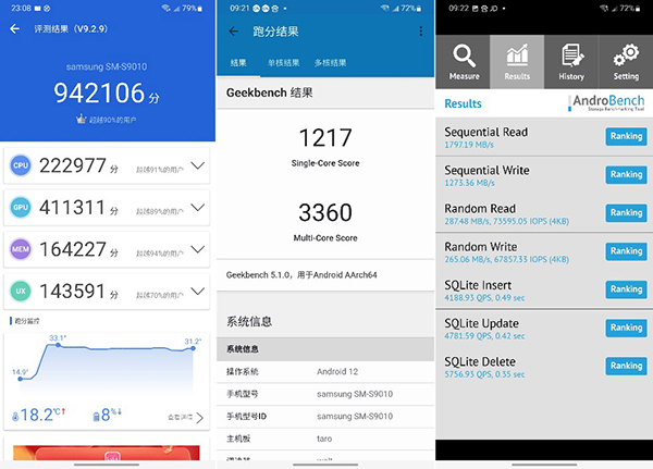 首先,小編對(duì)Galaxy S22和S22+分別進(jìn)行了安兔兔和GeekBench5跑分測(cè)試,可以看到,Galaxy S22的安兔兔跑分達(dá)到942106分,GeekBench5單核1217分,多核3360分,整體屬于驍龍8 Gen1的正常水平。另外,S22在AndroBench中的內(nèi)存讀寫(xiě)速度表現(xiàn)也十分出色。