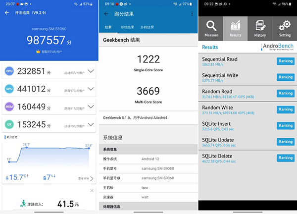 而Galaxy S22+的安兔兔跑分為987757,GeekBench5單核1222分,多核3669分,AndroBench的讀寫(xiě)表現(xiàn)整體也要比S22略高一些。