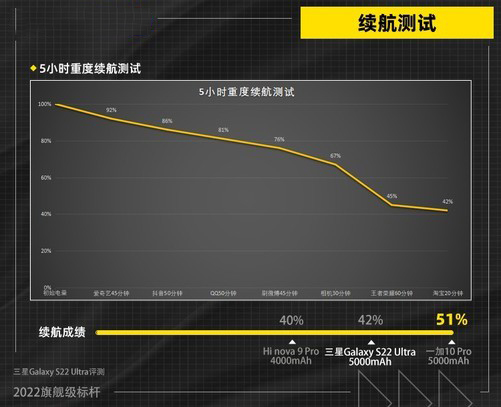 三星Galaxy S22 Ultra歷經(jīng)了五小時(shí)的暴力測(cè)試后,還剩了42%的電量。其中,游戲消耗的電量最多,消耗了22%的電量,基本滿足了大家重度使用一天的需求,為我們的日常生活提供了最大化的便利??梢詽M足長(zhǎng)續(xù)航只是最基本的要求,充電效率才是重點(diǎn)。我們接著對(duì)其進(jìn)行了50分鐘充電測(cè)試。