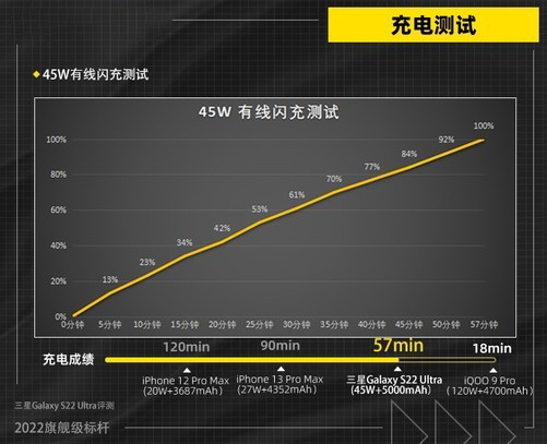 通過(guò)測(cè)試,我們不難發(fā)現(xiàn)三星Galaxy S22 Ultra在電量快耗盡的情況下,有能力為大家提供短時(shí)快速補(bǔ)能,僅需要五分鐘就可以為手機(jī)補(bǔ)充13%的電量,此后每五分種按10%遞增。最終在57分鐘便可以將手機(jī)充滿電,這樣的充電效率作為一款商務(wù)手機(jī)而言是非常優(yōu)秀的,在保證充電安全的前提下給到大家最好的充電體驗(yàn)。