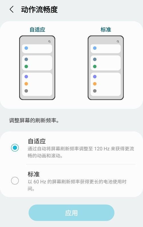 我們可以在設置中找到顯示選項,在這里我們自由調節(jié)屏幕的動作流暢度以及屏幕分辨率。動作流暢度選項可以調整屏幕的刷新率,其中被分為自適應與標準,標準就是將屏幕刷新率固定在60Hz不動,以此來獲得更長的電池續(xù)航;而自適應則為屏幕可以根據我們的瀏覽喜好自動調整至120Hz,以此獲得更流暢的動畫和滾動,從而提升我們的用機體驗。