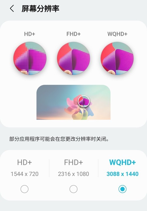 在屏幕分辨中,三星Galaxy S22 Ultra為我們提供了三種不同的分辨率,分別為HD+、FHD+與WQHD+,三者的區(qū)別在于屏幕顯示的細膩程度不同,WQHD+分辨率最高位3088×1440,配合120Hz的屏幕自適應刷新,真正做到了高刷低功耗。