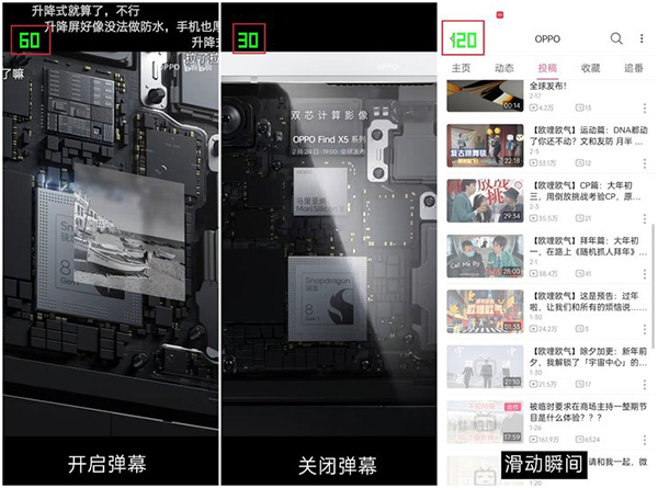 在B站播放視頻時(shí),開啟彈幕60Hz模式,關(guān)閉彈幕降低到30Hz模式,滑動(dòng)評(píng)論或者視頻列表會(huì)快速提升到120Hz,流暢度方面基本不用擔(dān)心。