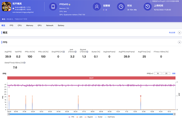 《和平精英》游戲,選擇超高清畫質(zhì)+最高幀率,一局游戲(15分鐘)平均幀率39.9,基本接近滿幀體驗(yàn)了,顯然沒有什么壓力。