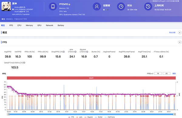 如上圖所示,超過30分鐘的高強(qiáng)度《原神》測試,OPPO Find X5 Pro的平均幀率為39.8,這個(gè)幀率數(shù)據(jù)中規(guī)中矩,通過幀率圖可以看到,在游戲的前兩分鐘,伴隨著溫度的提升,OPPO Find X5 Pro的幀率并沒有出現(xiàn)“斷崖式”的下降,而是一幀一幀的往下降,直到鎖定40fps,在剩下的時(shí)間里,無論是戰(zhàn)斗場景還是跑圖,幾乎都維持在40fps上,不為所動(dòng)。