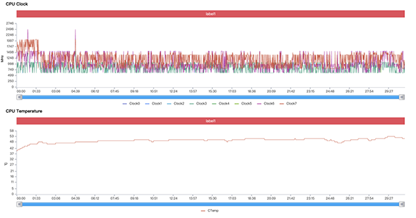 如下圖所示,在30分鐘的高強(qiáng)度原神游戲中,OPPO Find X5 Pro的3.0GHz超大核心,基本全程維持在1.5Ghz-1Ghz上下,幾乎沒怎么發(fā)力。而核心溫度則始終保持在50°C以下。