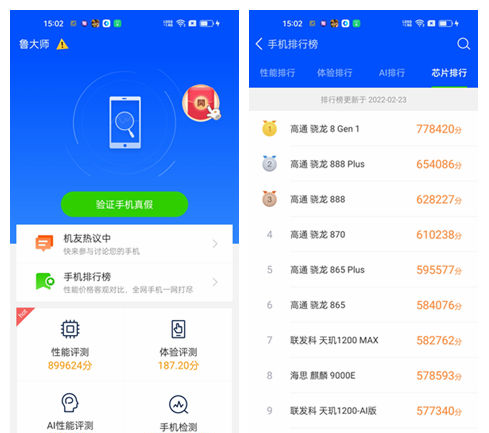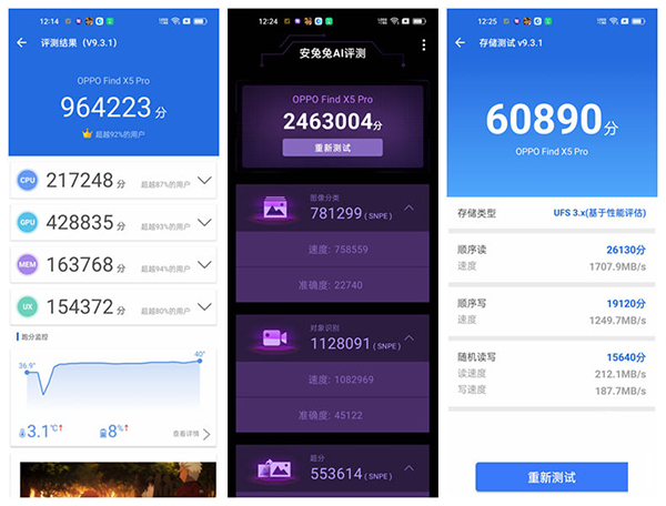 按照以往慣例,科技犬首先選擇使用安兔兔和魯大師兩款跑分軟件做了跑分測(cè)試(默認(rèn)開(kāi)啟 性能模式)。實(shí)測(cè)OPPO Find X5 Pro的安兔兔成績(jī)?yōu)?64223分,魯大師為1225169分,整體表現(xiàn)符合其定位。